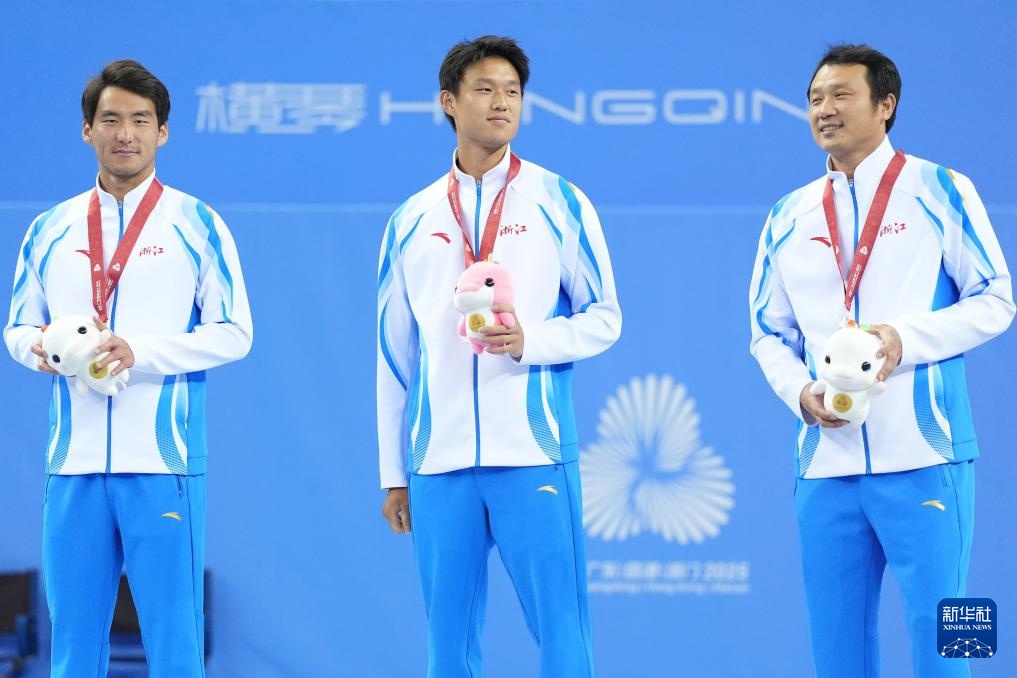 11月19日,亚军浙江队组合布云恰克(左)/郑展(中)与教练在男双颁奖典礼上。当日,第十五届全运会网球男双颁奖典礼在广东横琴举行。新华社记者 颜林云 摄 11月19日,亚军浙江队组合步云朝克(左)/郑战在男双颁奖典礼上。当日,第十五届全运会网球男双颁奖典礼在广东横琴举行。新华社记者 颜林云 摄 11月19日,江苏队冠军组合唐胜(左)/孙茜(中)携教练出席男双颁奖仪式。当日,第十五届全运会网球男双颁奖典礼在广东横琴举行。新华社记者 颜林云 摄 11月19日,团体对亚军唐胜/孙茜、季军北京队组合崔杰/T在男子颁奖仪式上,他们的教练获得了里格莱和第三名。当日,第十五届全运会网球男双颁奖典礼在广东横琴举行。新华社记者 张晨林 摄 11月19日,江苏队唐胜/孙茜(右)组合出席男双颁奖典礼。当日,第十五届全运会网球男双颁奖典礼在广东横琴举行。新华社记者 颜林云 摄