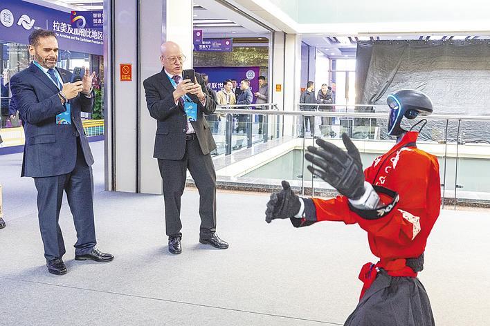 参加汉博会的巴拿马驻华大使雷明拿出手机拍摄机器人舞蹈。 (湖北日报全媒体记者倪娜 通讯员黄轩 刘春 摄)