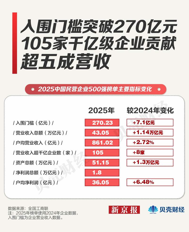 8月28日,全美工业和商业联合会发布了“ 2025年中国前500家私营企业”。该列表表明,中国私人企业的整体发展保持了稳定而进步的趋势,并且进一步增强了企业的质量,效率和基本竞争。今年,2024年共有6,379家企业经营超过10亿元人民币,参加了全美工业和商业联合会组织的一项调查。拥有营业收入的前500家企业属于2025年中国前500家私人企业,以及JD.com,Alibaba(中国)Co,Ltd。和Hengli Group Co,Ltd排名前三。 2025年,“中国前500家私营企业”的特征是什么?与去年相比,公司规模改变了什么变化?北京新闻的一名记者在过去两年中审查了“中国的前500家私人企业”,并探索了私人企业的如何”e提高了相同的数量和质量”,并将改变高质量的发展。前500家私人业务的平均净增长率是不变的。在其中增长了2.72%,总计1000亿元的企业增加到了105%,比去年有11个企业,其总收入成本超过5000亿元,而前500家私人企业的总收入为19%有限公司,JD.com以前已经排名1.16亿元的收入。稳定的增长,总计51.15万亿元的增长,去年增长了1.3万元人民币,平均家庭房地产达到10030.9亿元人民币,增长了2.62%。业主进一步集中在顶级企业中,其中财产超过1000亿的企业数量增加到97个,去年增加了8个,16家拥有财产超过5000亿美元的企业达到了1个,这反映了积累的重大影响。从公司收入的角度来看,今年列出的私人企业的经营益处显着策划,收入质量也有所提高。净营业净收入为1.8亿元人民币,每个家庭的平均净利润为36.0亿元人民币,增加了6.48%,增长率高于收入,反映了其降低成本,提高效率和结构优化的结果。此外,使用前500个Priv的资本的效率Ate企业继续改善,平均股权回报率为10.61%,而流动所有权的总比率为86.62%。从区域分配的角度来看,2025年中国前500家私营企业仍由经济省份领导。在千江,江苏,广东和山东省份的企业总数为299,价值59.8%,占前500名。86.111亿元人民币的总数。对于诸如Byd和Tencent之类的巨型技术的宏伟,它提高了总体水平,收入量表分别为8620亿元,7777亿元人民币和6603亿元人民币。在企业数量的前五省中,江苏和山东的平均收入小于全国平均水平,分别为694.0亿元人民币和81001亿元人民币。在2025年,22家北京公司列为名单,但其平均收入达到了1930.61亿元人民币,是该国最高的。互联网和技术公司例如JD.com,联想,小米和Meituan贡献了他们的主量表,收入达到11.6万亿元,5128亿元,3659亿元和3376亿元和3376亿元和3376亿元,而2024年在2024年分别是领先的业务中的主要业务。私人企业的创新推动了质量和效率升级,研发投资超过113万亿美元。来自“ 2025年中国前500家私人企业”的数据显示,领先的私人企业通过投资技术,数字化转型和新兴的轨道布局,在规模和效率上取得了双重突破。变革和转型促进了私人业务的持续高质量发展,公司的目的是从“规模的增长”转变为“质量和效率”。从行业特征的角度来看,在前500家私营企业中,有66.4%在制造业中。企业积极制作广告正当形式的新兴行业。实际提交的309家公司投资于627个项目,涵盖了战略新兴行业,例如新材料,新能源,新一代信息技术,高端设备,新能源车辆,能源预防措施和环境保护。此外,前500家私营企业的研发投资显示出持续的增长率,总研发成本增加到11.13万亿元,增长了7.6%。企业不仅在研发上投入更多的钱,而且还要关注其战略性和长期性质。其中,研发成本超过10亿元的企业数量从159亿元增加到171人;研发的企业数量的成本超过50亿元和100亿元人民币增加了4和2;投资的平均研发成本从2.66%增加到2.77%,增加了0.11%。专利产出能力也大大提高。 numbe2025年有效专利的R达到721,600,同比增长了8.2%。特别值得注意的是,国内有效专利的增长率从8.86%急剧增加到12.42%,增加了3.56%。独立的变化私人业务和专利质量的能力正在迅速改善。全美工业和商业联合会同时发布了“中国2025年的前100名私人企业”服务业务。根据数据,前100名服务行业公司的平均收入超过1000亿元人民币,其中六个省的平均收入在内,包括北京,狮子,Zhejiang,Zhejiang,Quangdong,Tianjin和Hubei超过了国家一级,北京的平均收入达到了平均收入,达到了1.943亿YUAN。江苏,江苏,北京和广东的企业数量超过10,总值62,价值超过60%。尽管江苏等级在业务数量中排名第二,但其平均E收入是505.63亿元人民币,缺乏顶级企业的支持。通常,在排名前100名的服务行业中,技术平台和高端服务公司正在领先增长,传统的业务格式面临着转型压力。将来,该地区的竞争取决于是否可以培养它们。带领领导者加入服务。协调:Ren Jiao记者:Dong Yinan设计:Ren Wanqing校对:Wang Xin
