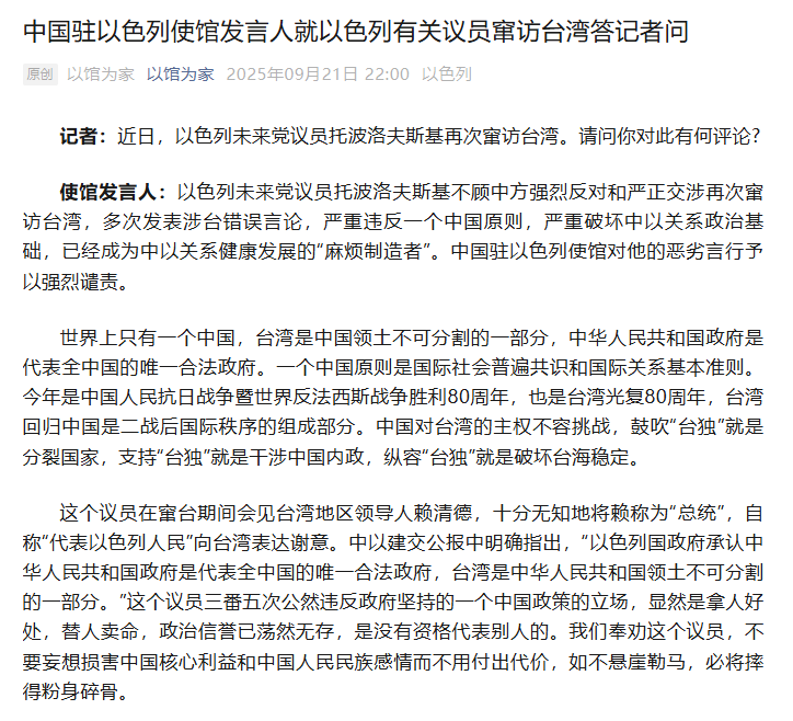 以色列中国大使馆的发言人回答了记者访问台湾以色列的来访议员的问题 - 北京新闻